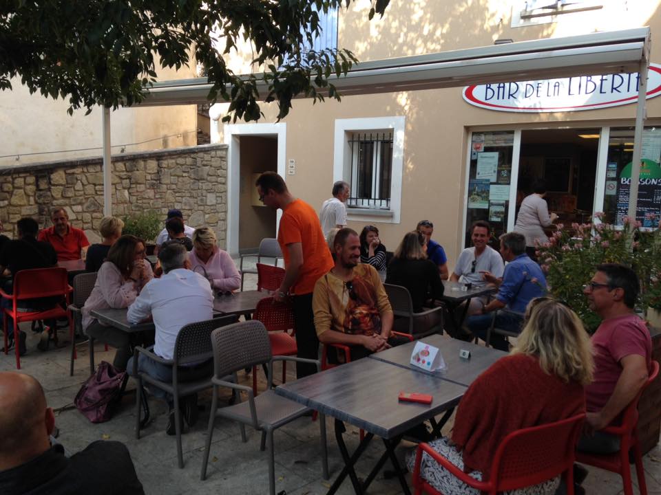 La friterie où nous devions nous arrêter en fin de parcours s’étant “plaint” la veille que nous ne consommerions pas assez, j’ai trouvé le matin en urgence un bar sur Mormoiron, a 8km, le bar de la Liberté. Endroit bien sympathique pour finir la journée autour d’un verre.